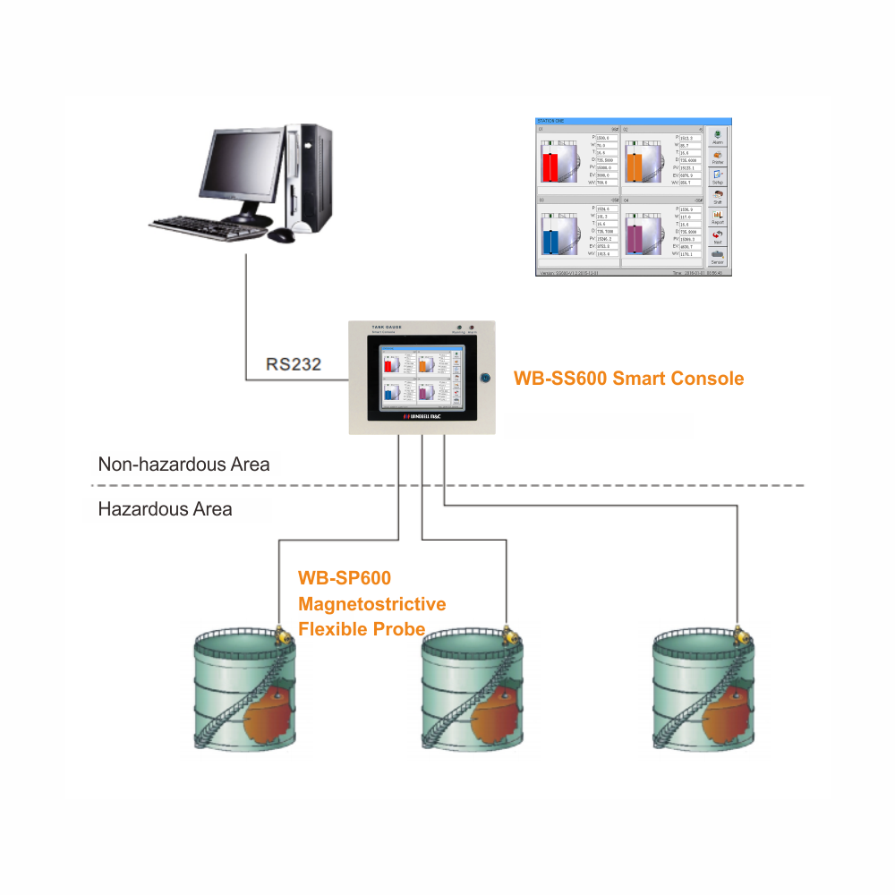 The WB-SP600 magnetostrictive flexible probe is a device that utilizes the principle of magnetostriction for liquid level measurement, characterized by high precision, high reliability, and long lifespan. It mainly consists of measuring rods, electronic warehouses, magnetostrictive wires (waveguide wires), and flexible cables. It is usually installed in oil tanks in oil depots for real-time monitoring of parameters such as liquid level, interface, and temperature.