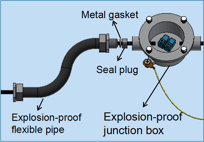 2) Tighten the explosion-proof flexible pipe to compress the metal gasket and seal plug to prevent oil and gas from leaking to the explosion-proof junction box through the explosion-proof flexible pipe.
